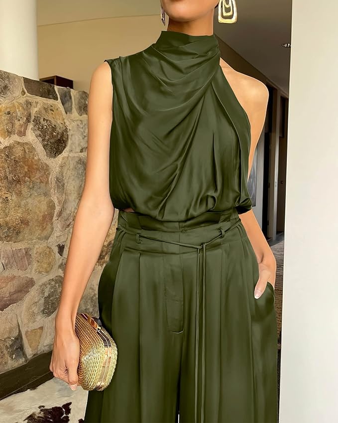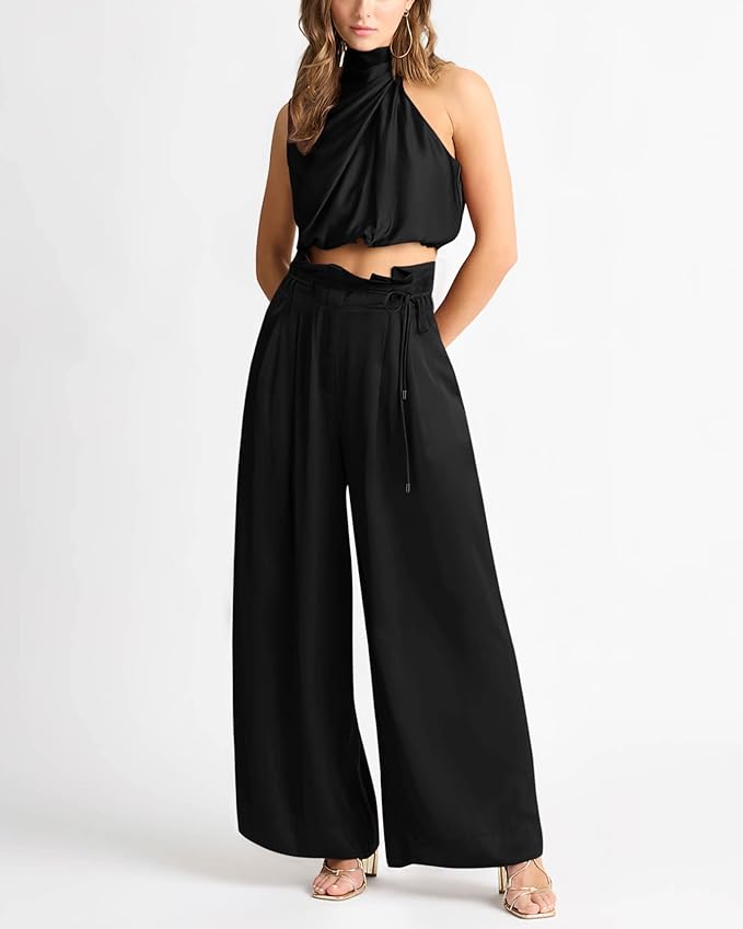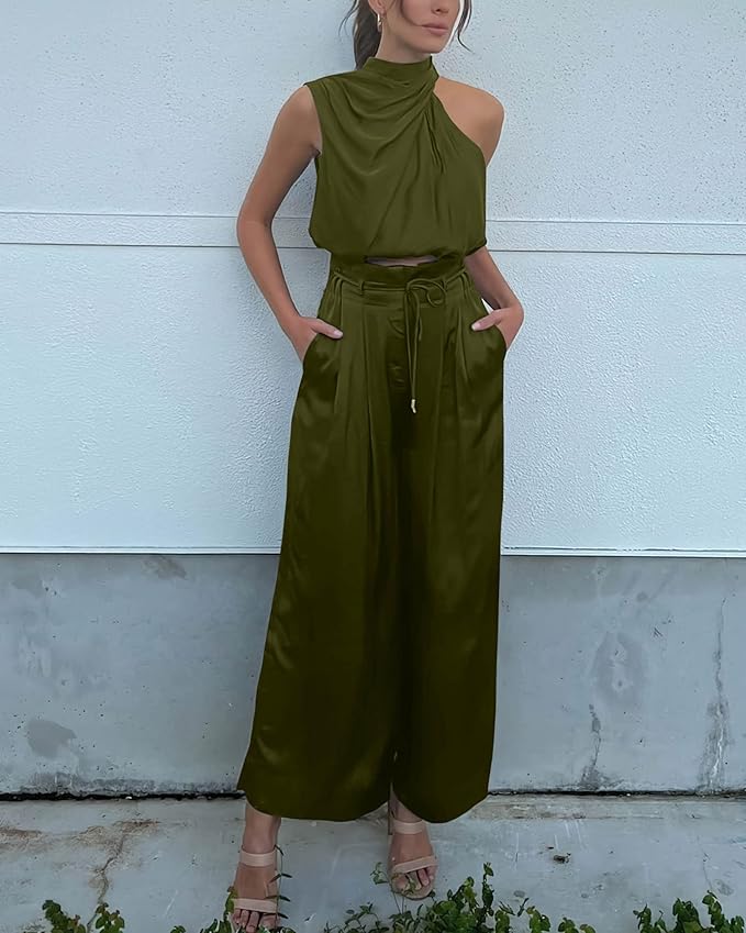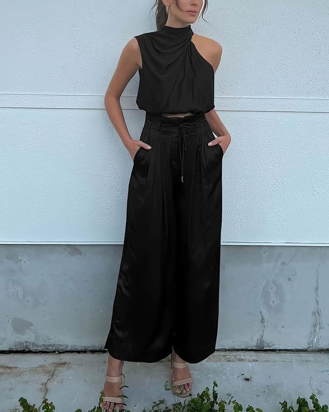 This sleeveless top and wide-leg pants set exudes effortless chic with its clean lines and relaxed fit. The sleeveless top has a flattering V-neck, while the wide-leg trousers ensure comfort and style, making it the perfect ensemble for any day.